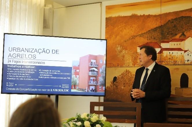 A ocasião incluiu a cerimónia de entrega simbólica de chaves a 14 famílias beneficiárias do programa, seguida de uma deslocação ao Bairro de Agrelos, para uma visita às obras de reabilitação dos 24 fogos habitacionais distribuídos pelos três blocos que compõem o bairro.